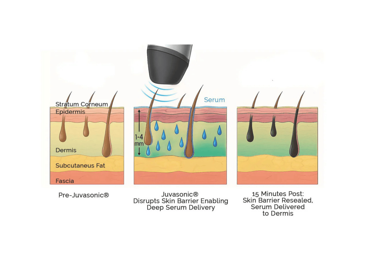 Using a combination of precision microchannel vibration, microdermabrasion-style mechanical energy, and dual-wavelength LED light (red + blue), Juvasonic® temporarily and gently disrupts the skin’s barrier (stratum corneum). This allows high-value topicals — such as exosomes, peptides, PRP, PDRN, and growth factors — to penetrate more effectively.